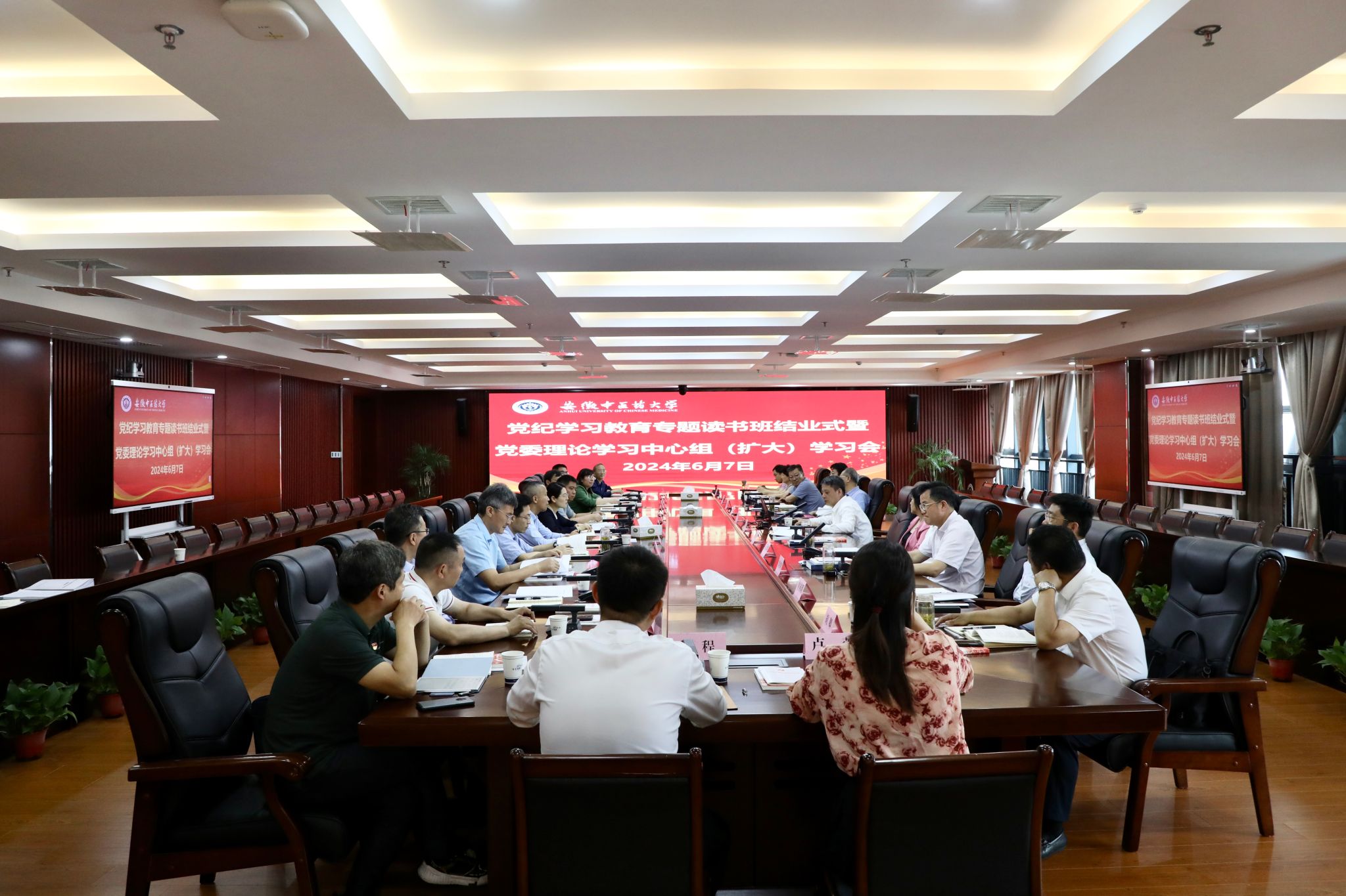 6月7日上午,学校举行党纪学习教育专题读书班结业式暨党委理论学习中心组第七次(扩大)学习会。校领导许钒、戴敏、魏骅、石金明、高怀荃,校党委常委罗绍明、聂久胜,校党委理论学习中心组成员,各分党委、党总支、直属党支部书记,相关职能部门负责人参加会议。