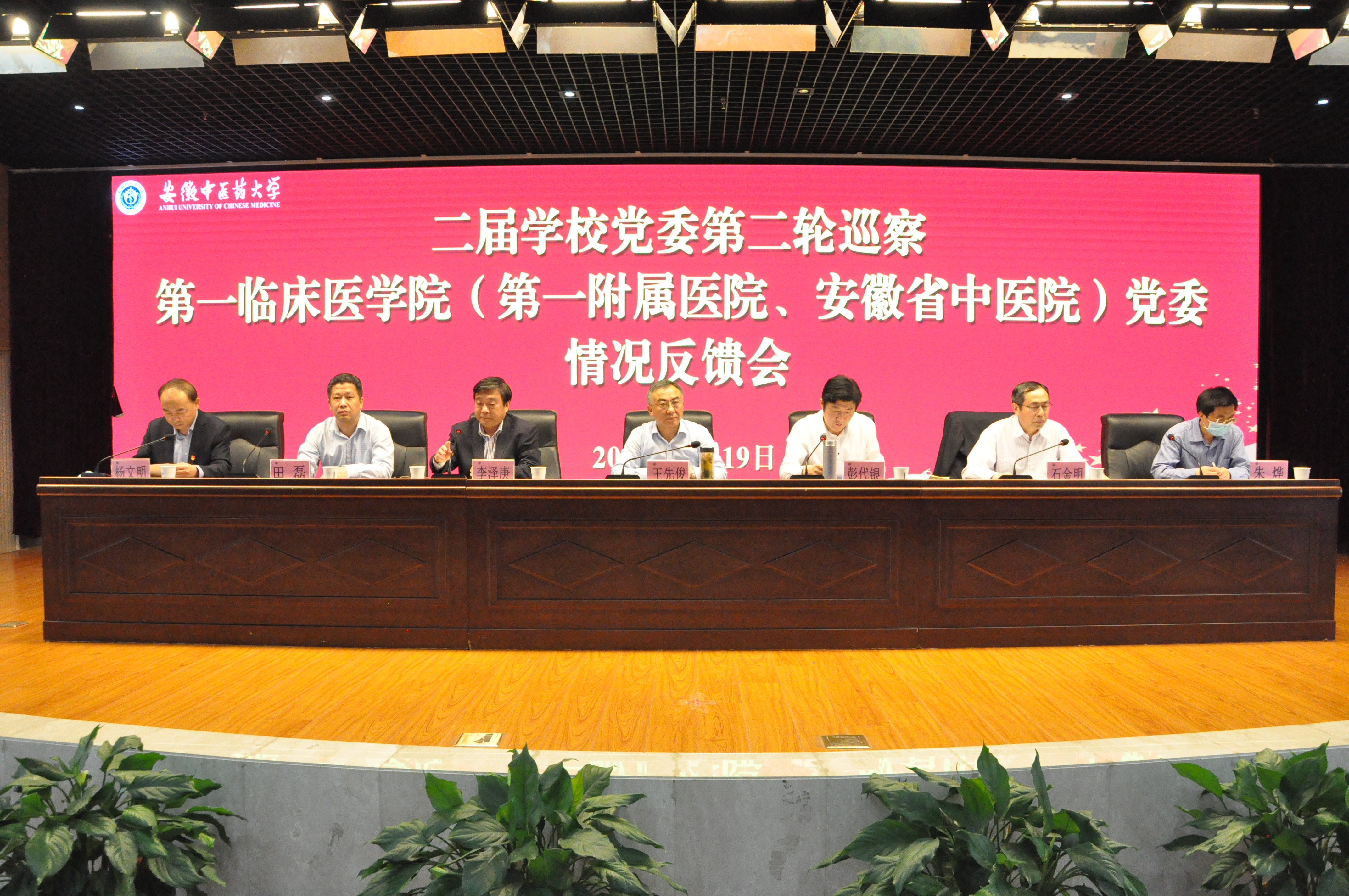 根据学校党委巡察工作统一部署,5月19日下午,二届学校党委第二轮巡察组巡察第一临床医学院(第一附属医院、安徽省中医院)党委情况反馈会在医院基地大楼科研楼学术报告厅召开。学校党委书记王先俊,党委副书记、校长彭代银,党委常委、副校长、科学院专职副院长李泽庚,党委常委、纪委书记、省监委驻学校监察专员、巡察组组长石金明出席会议,学校相关职能部门主要负责人、第二、三临床医学院班子成员参加会议。会议由彭代银主持。