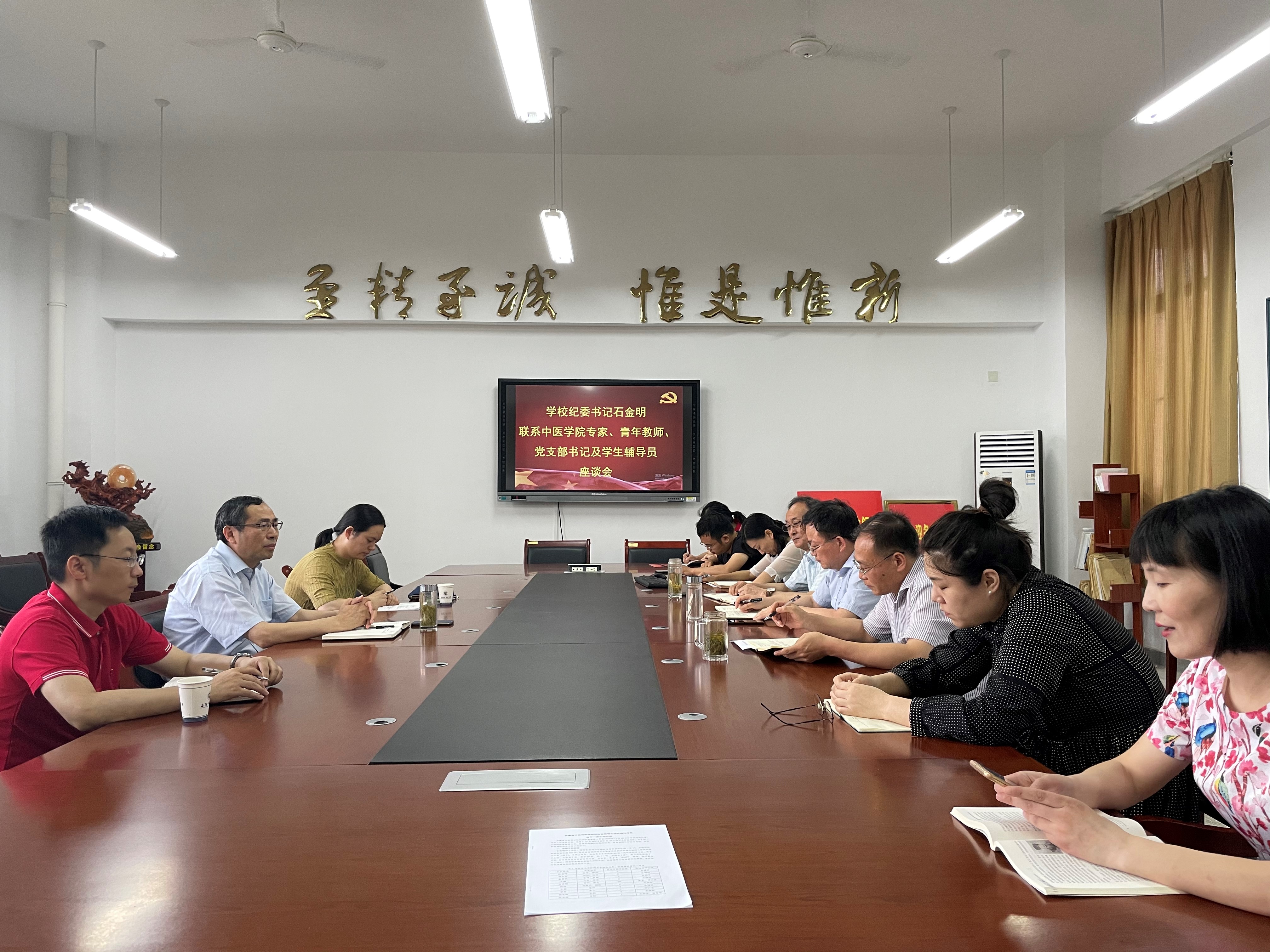 6月25日上午,学校党委常委、纪委书记、监察专员石金明一行到中医学院开展座谈调研,看望慰问联系的专家教授、青年教师、党支部委员及班级辅导员。中医学院领导班子成员、校党委办公室、纪委办公室工作人员参加了座谈会。