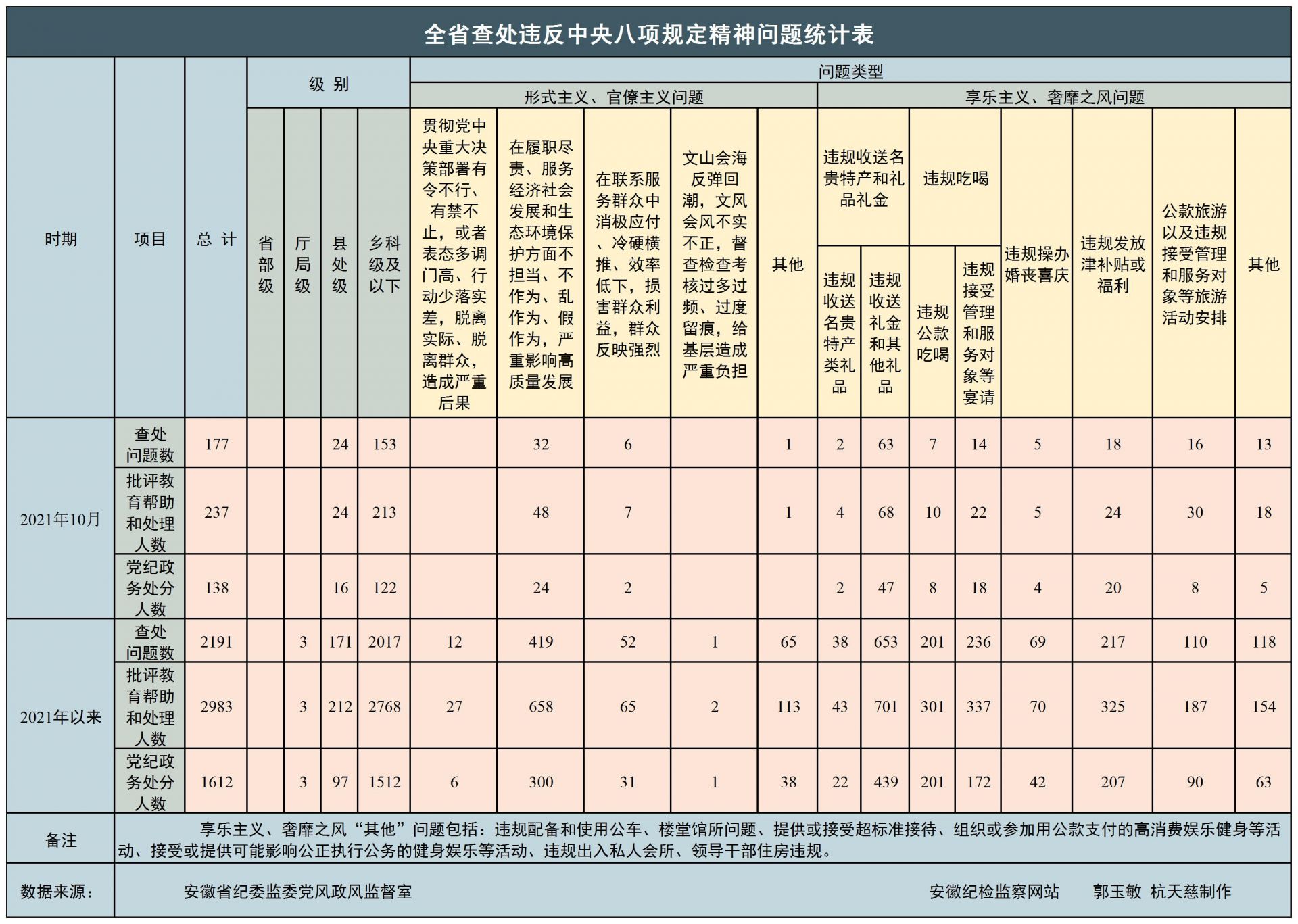 2021年10月,全省纪检监察机关共查处违反中央八项规定精神问题177起,批评教育帮助和处理237人,其中给予党纪政务处分138人,同比分别下降24.4%、24.3%、上升2.2%。