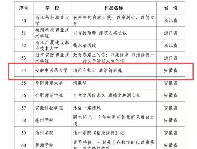 长期以来,学校高度重视学校廉洁文化建设,始终把廉洁文化建设作为落实立德树人根本任务的重要抓手,组织开展系列活动,引导师生守廉践廉,营造校园崇廉尚洁的浓厚氛围。下一步,学校将以此次作品入选为契机,进一步深挖具有“中医药味”的廉洁资源,以文化人、以廉润心,不断创新形式载体,提升廉洁教育质效,持续营造风清气正育人环境。(牛凯/文图 金晓琴/审核)