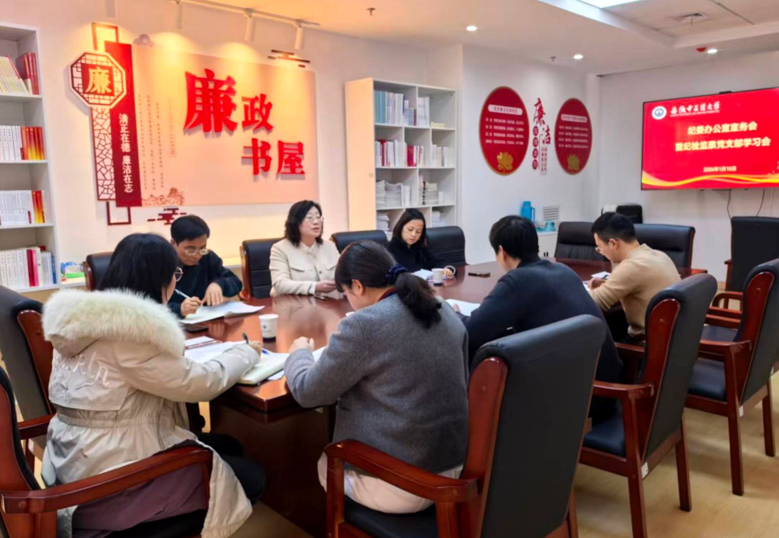 2026年1月15日,纪检监察党支部在廉政书屋召开党支部学习会议,校党委常委、纪委书记、监察专员詹灵杰以普通党员身份参加会议,会议由纪检监察党支部书记金晓琴主持。